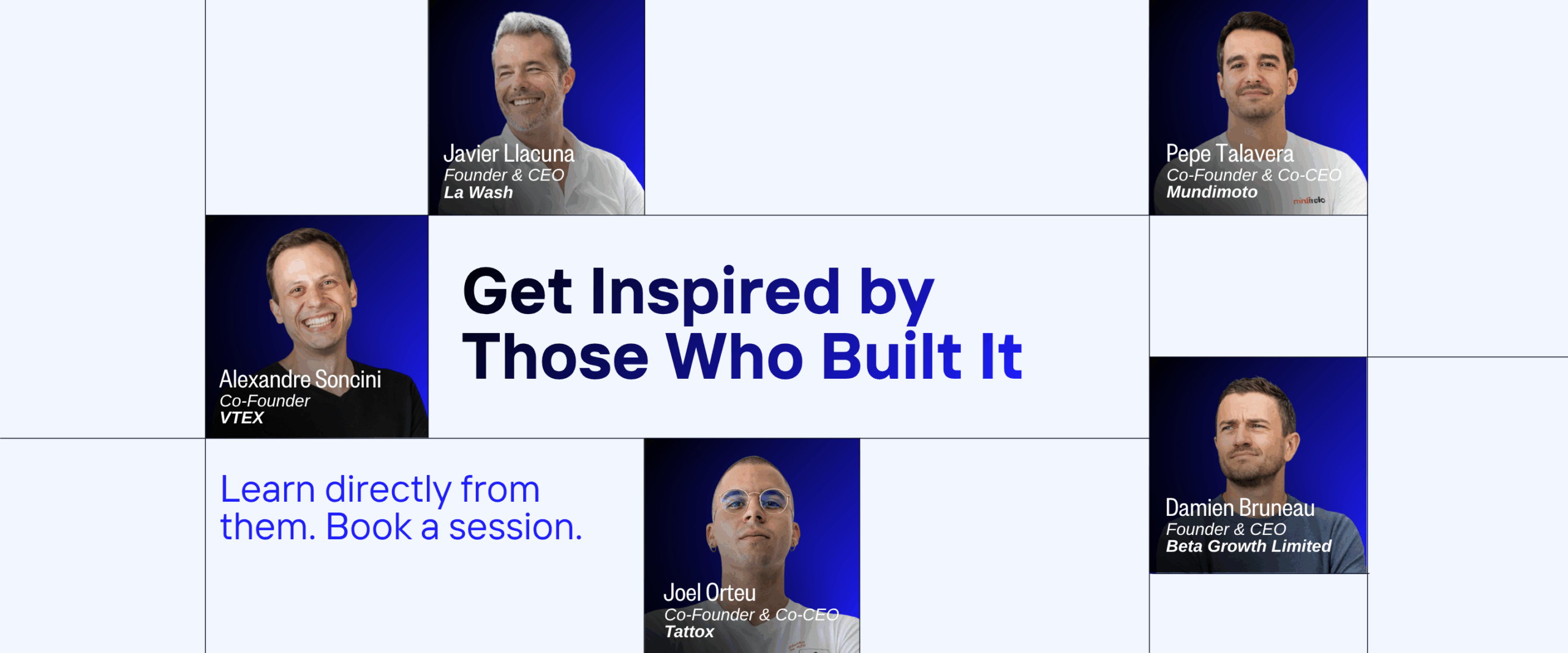 Office Hours · Abril 2026 Get inspire by those who have already built it Learn how to scale your startup by speaking 1:1 with founders who’ve already done it. Book a session Join as a mentor ASEcommerce SaaSAlexandre SonciniCo-FounderVTEX · Digital Commerce PlatformBook your spot →JLHome Services TechJavier LlacunaFounder & CEOLa Wash · On-demand ServicesBook your spot →JOMarketplaceJoel OrteuCo-Founder & Co-CEOTattoox · Tattoo Marketplace Book your spot →PTMobility TechPepe TalaveraCo-Founder & Co-CEOMundimoto · Mobility TechBook your spot →DBGrowth & MarketingDamien BruneauFounder & CEOBeta Growth · Marketing TechBook your spot → Looking for real feedback on your startup? April spots are limited with small group sessions. Choose your mentor and book your 30-minute session. Book a session Join as a mentor